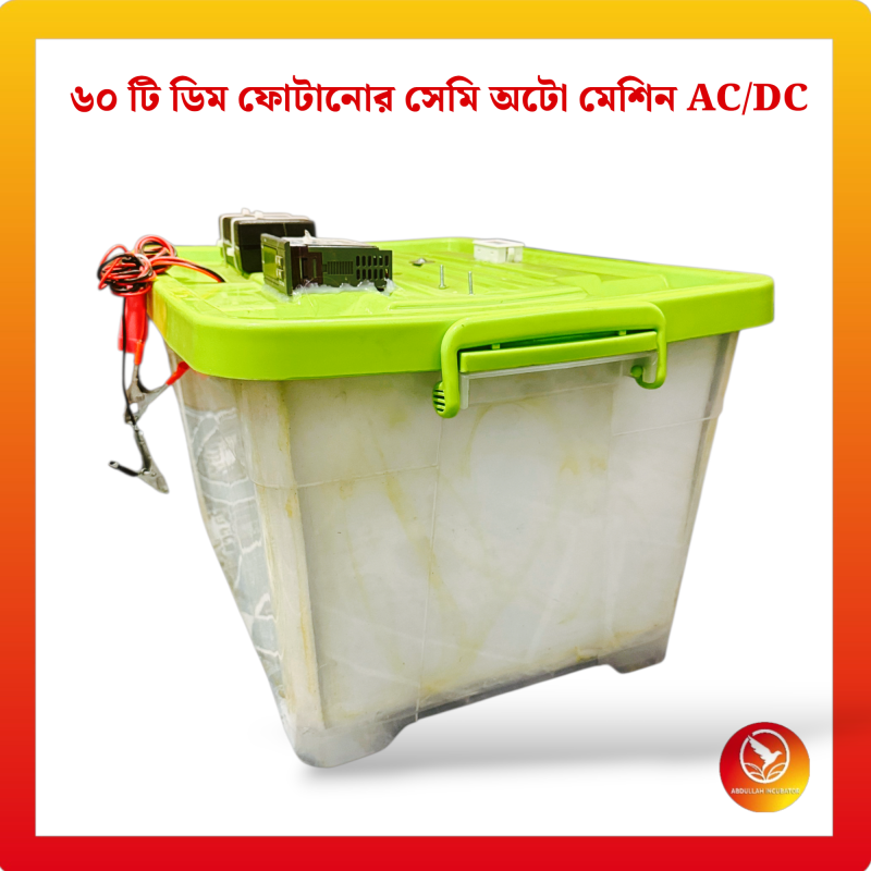 ৬০ ডিমের ইনকিউবেটর মেশিন হলো একটি আধুনিক ডিম ফোটানোর যন্ত্র, যা ১০০% সফলভাবে বাচ্চা ফোটাতে সক্ষম। মেশিনটিতে স্বয়ংক্রিয় টেম্পারেচার কন্ট্রোল, আর্দ্রতা নিয়ন্ত্রণ ব্যবস্থা এবং বিদ্যুৎ সাশ্রয়ী হিটিং সিস্টেম রয়েছে।
